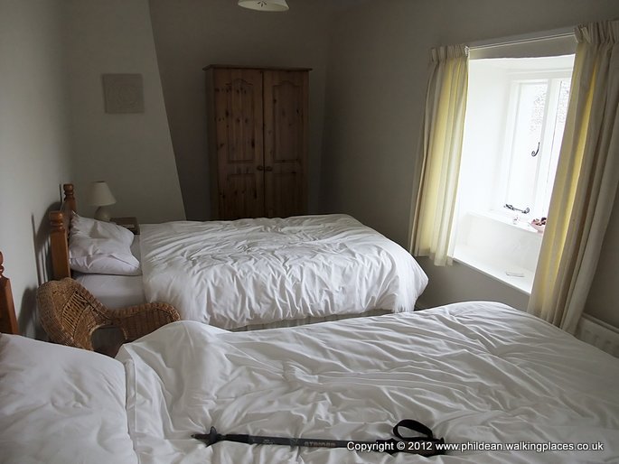 Before we were allowed inside though we were directed to a barn and instructed to remove boots and waterproofs and hang them on the washing lines strung from the rafters. There was a pile of newspapers provided for us to stuff in our boots to aid drying much to Niges’ relief. Although a working farm the accommodation was really cosy and welcoming. We were given the tour downstairs including the lounge / dining room where we would breakfast the next morning. Homemade cakes and hot drinks were on a table in the corner and it seemed rude not to partake after all the trouble the hostess had gone to make them look so appealing. We felt ourselves sinking into the comfort of the big settees that surrounded a large flat screen TV and it was only the weather forecast coming on advising us of heavy rain for the next few days that snapped us out of the false paradise and back to the harsh reality of what lay ahead. We showered and Nige re-packed his suitcase which gave me time to take a couple of photos of the room and the view from the window which showed ominous dark clouds building once again in the distance.