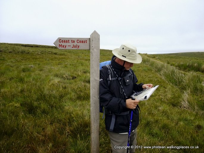 A few months before starting this trip I was diagnosed with a ‘frozen shoulder’. The only real inconvenience up to this point had been the awkwardness of putting my jacket on and off or reaching up when climbing stiles. However, as we finished our photo shoot I reached out instinctively to catch my walking pole which was slipping off one of the monuments and I found myself bent over double in pain rocking backwards and forwards. Nige told me later that I let out quite a cry but I don’t remember that. All I remember is that it really hurt. Not wanting to make too much of a spectacle of myself in front of the growing number of people reaching this landmark I told Nige I was ok and we should move on swiftly. As we did a group of ladies nearby came over very concerned and asked Nige if I was ok. I suppose seeing a bloke bent over clutching one arm across his chest and face contorted in pain made them think I was having a heart attack. More embarrassed than anything we moved on quickly but not before we checked we were taking the correct route. The satnav (The ‘Precious’) really came into its own and led us perfectly across the deep undulating bogs. It wasn’t quite as bad as we expected, not that much different than some of the terrain around Bleaklow and Kinder Scout which we were used to walking.